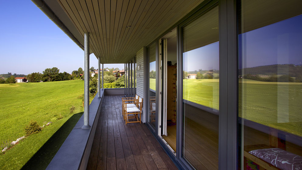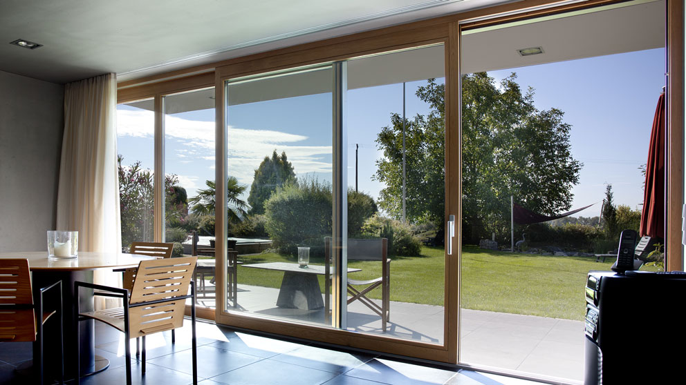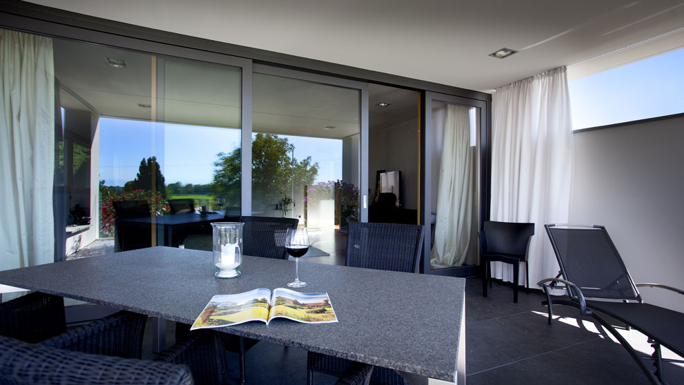 Die Terrassentür wird auf kleinen Rollen entlang einer thermisch getrennten Aluminium-Bodenschwelle zur Seite geschoben und lässt sich neben der Türöffnung abstellen. Somit ragt kein störender Türflügel in den Wohnraum. Der schwellenlose Durchgang auf die Terrasse oder den Balkon erweckt den Eindruck, als würden drinnen und draußen miteinander verschmelzen. Gönnen Sie sich diese Freiräume!