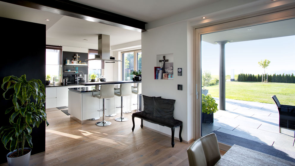 Der moderne Wohnstil ist geprägt von großen Fensterflächen. Großzügiger Durchblick mit Glasfassaden, bodentiefen Fenstern und Hebe-Schiebe-Türen lassen natürliches Tageslicht durch Ihre Wohnräume strömen. Die hochwertigen KNEER-SÜDFENSTER Hebe-Schiebe-Türen aus Holz und Aluminium-Holz liefern dazu eine besonders elegante Optik und einen nahtlosen Panoramablick. Die flache Bodenschwelle macht sie außerdem barrierefrei. Mit einer Soft-Close-Funktion und der Anbindung an Ihre Hausautomatisierung erhalten Sie zusätzlichen Komfort in der Bedienung. Auch bei großen Glasflächen müssen Sie auf solide Wärmedämmung und verlässliche Sicherheit nicht verzichten. Unsere Hebe-Schiebe-Türen bieten Einbruchschutz bis Widerstandsklasse RC-2.