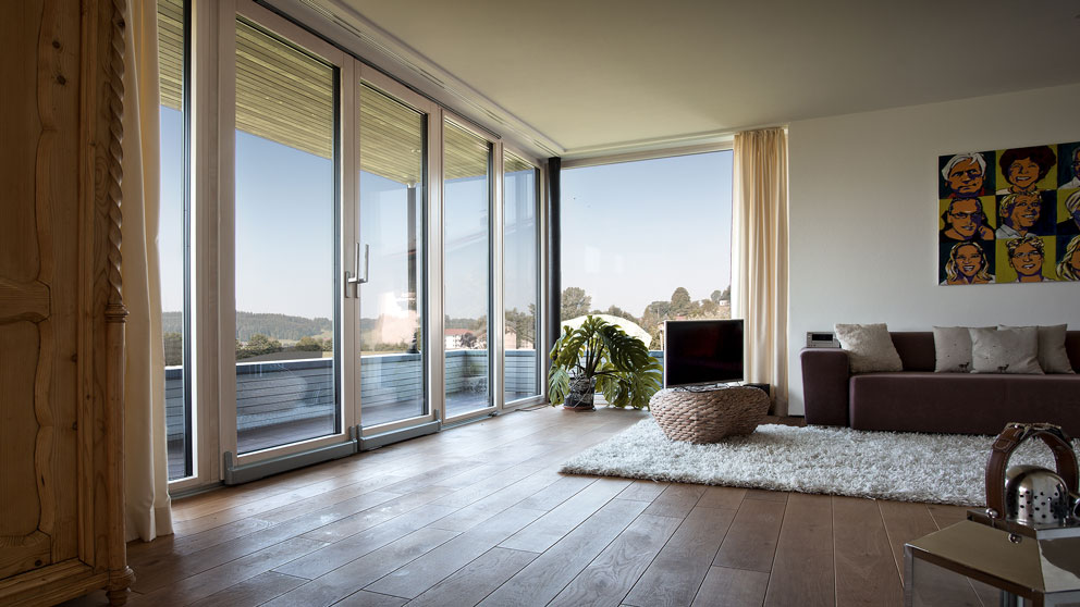 Die Terrassentür wird auf kleinen Rollen entlang einer thermisch getrennten Aluminium-Bodenschwelle zur Seite geschoben und lässt sich neben der Türöffnung abstellen. Somit ragt kein störender Türflügel in den Wohnraum. Der schwellenlose Durchgang auf die Terrasse oder den Balkon erweckt den Eindruck, als würden drinnen und draußen miteinander verschmelzen. Gönnen Sie sich diese Freiräume!